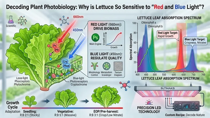 This comprehensive guide will decode, from a professional photobiology and agricultural engineering perspective, how the precise red-to-blue light ratio controls nitrate levels and structural crispness in leafy lettuce at both the molecular and metabolic levels. We will thoroughly explore how to leverage this foundational scientific principle, synergistically combined with SLTMAKS’s highly efficient, spectrum-tunable lighting solutions, to help commercial growers break through persistent cultivation bottlenecks and consistently produce high-premium, top-tier agricultural products.